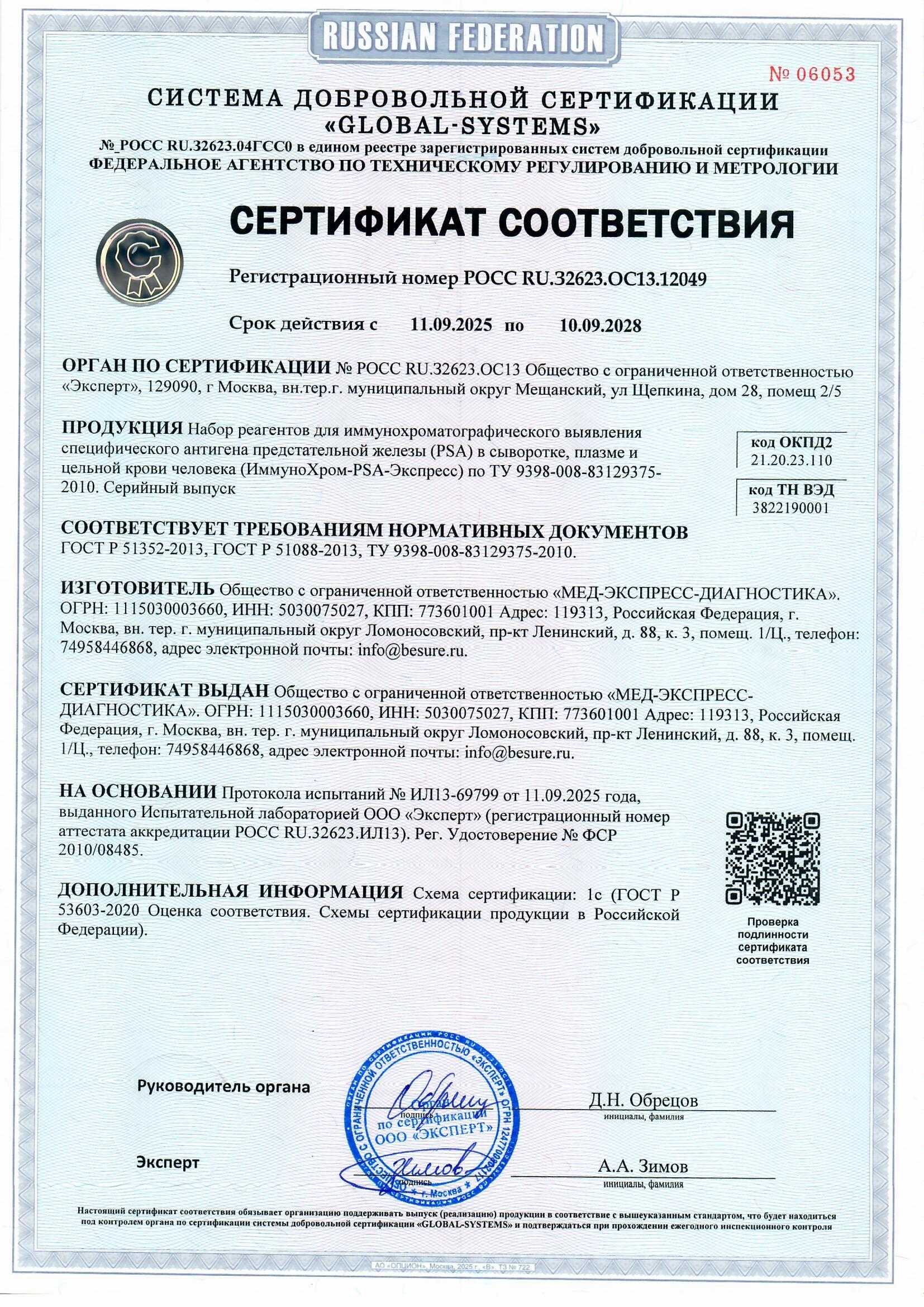Набор ИммуноХром-PSA-Экспресс предназначен для одноэтапного быстрого полуколичественного определения содержания специфического антигена предстательной железы (PSA) in vitro в сыворотке, плазме и цельной крови человека методом иммунохроматографического анализа. Простатспецифический антиген (PSA) синтезируется эндотелиальными клетками предстательной железы и представляет одиночную цепь гликопротеина с молекулярным весом ~34 кДа. Уровень PSA в сыворотке здорового мужчины находится в пределах от 0,1 до 2,6 нг/мл. При раке простаты и при доброкаченственной опухоли - аденоме простаты, а также при простатите концентрация PSA повышается. Уровень от 4 до 10 нг/мл считается пограничным, требующим дальнейшего клинического обследования, в то время как уровень выше 10 нг/мл с большой вероятностью указывает на рак простаты.