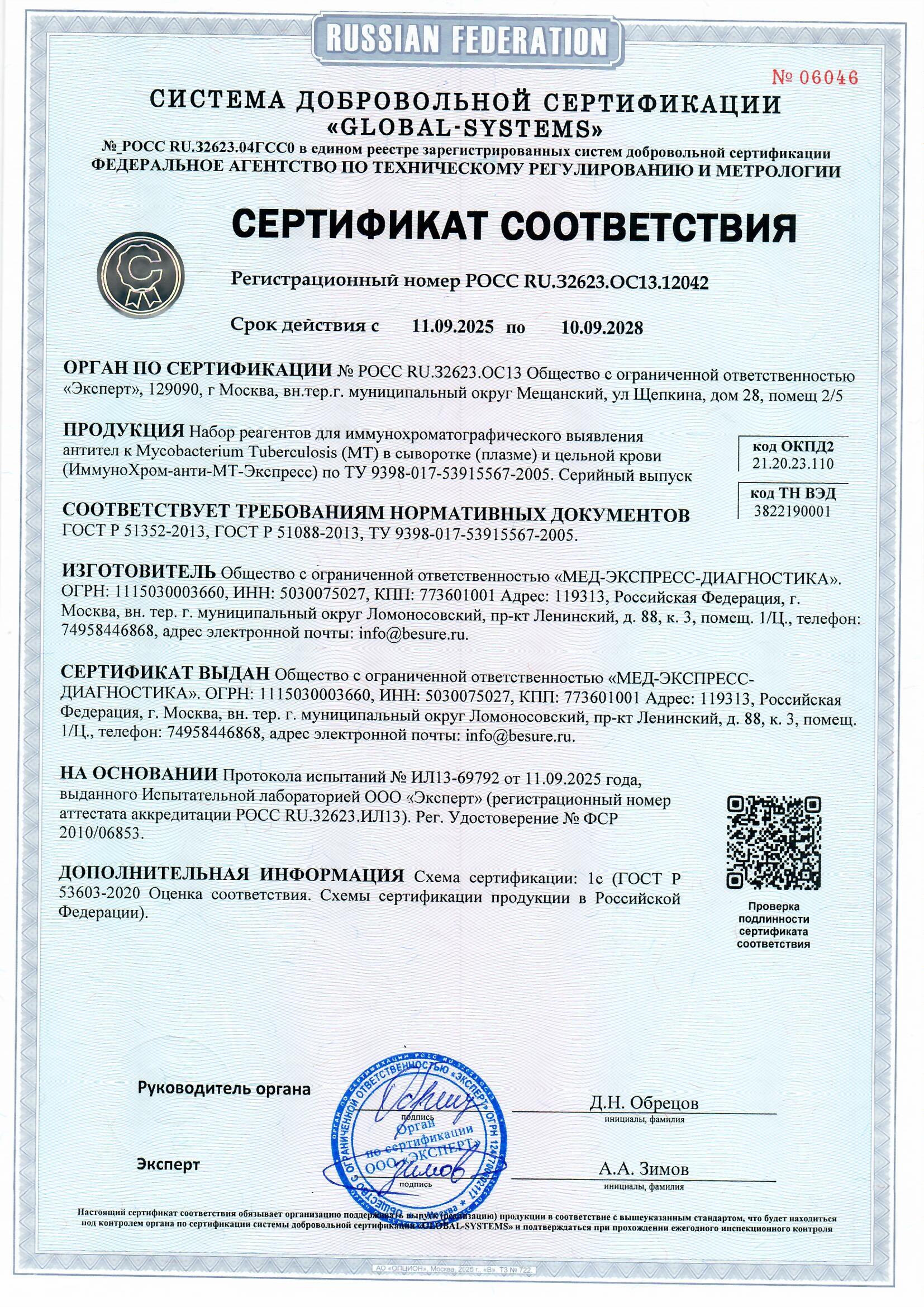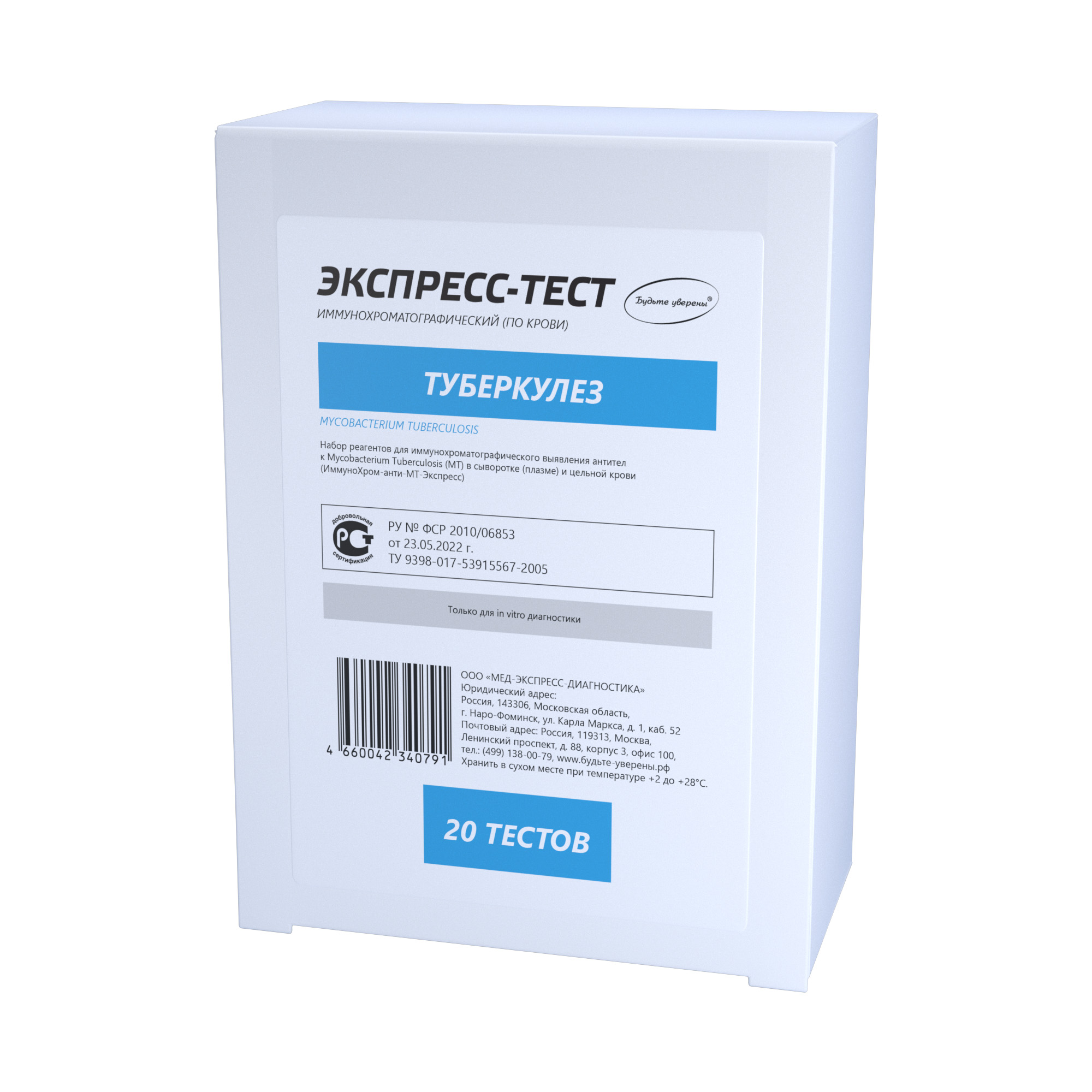 Набор ИммуноХром-анти-МТ-Экспресс предназначен для in vitro одноэтапного быстрого качественного выявления антител IgG, IgM и IgA классов к Mycobacterium Tuberculosis (MT) в сыворотке (плазме) и цельной крови человека методом иммунохроматографического анализа.