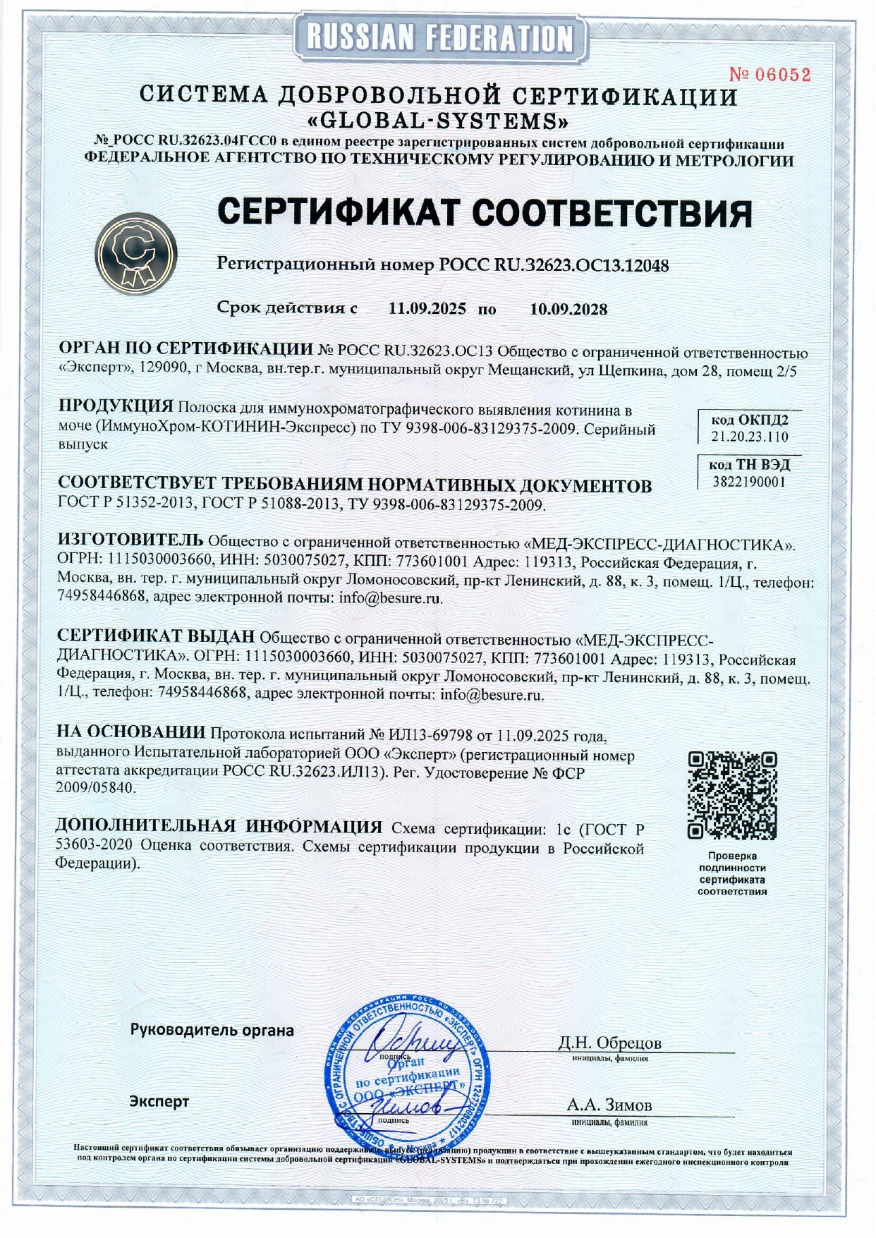 Полоска ИммуноХром-КОТИНИН-Экспресс предназначена для in vitro одноэтапного быстрого качественного определения котинина (основного метаболита никотина) в моче человека методом иммунохроматографического анализа в клинической практике, а также для самоконтроля. Результат определения с помощью полоски ИммуноХром-КОТИНИН-Экспресс следует рассматривать как предварительный. Для подтверждения положительных результатов рекомендуется использовать метод газовой хроматографии/масс-спектрометрии (ГХ/МС).